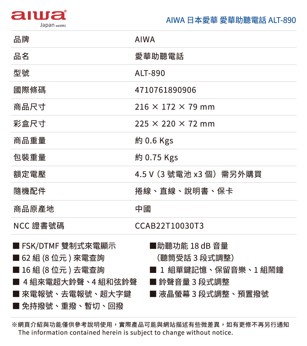 - 助聽功能 18 dB 音量(聽筒受話 3 段式調整)
