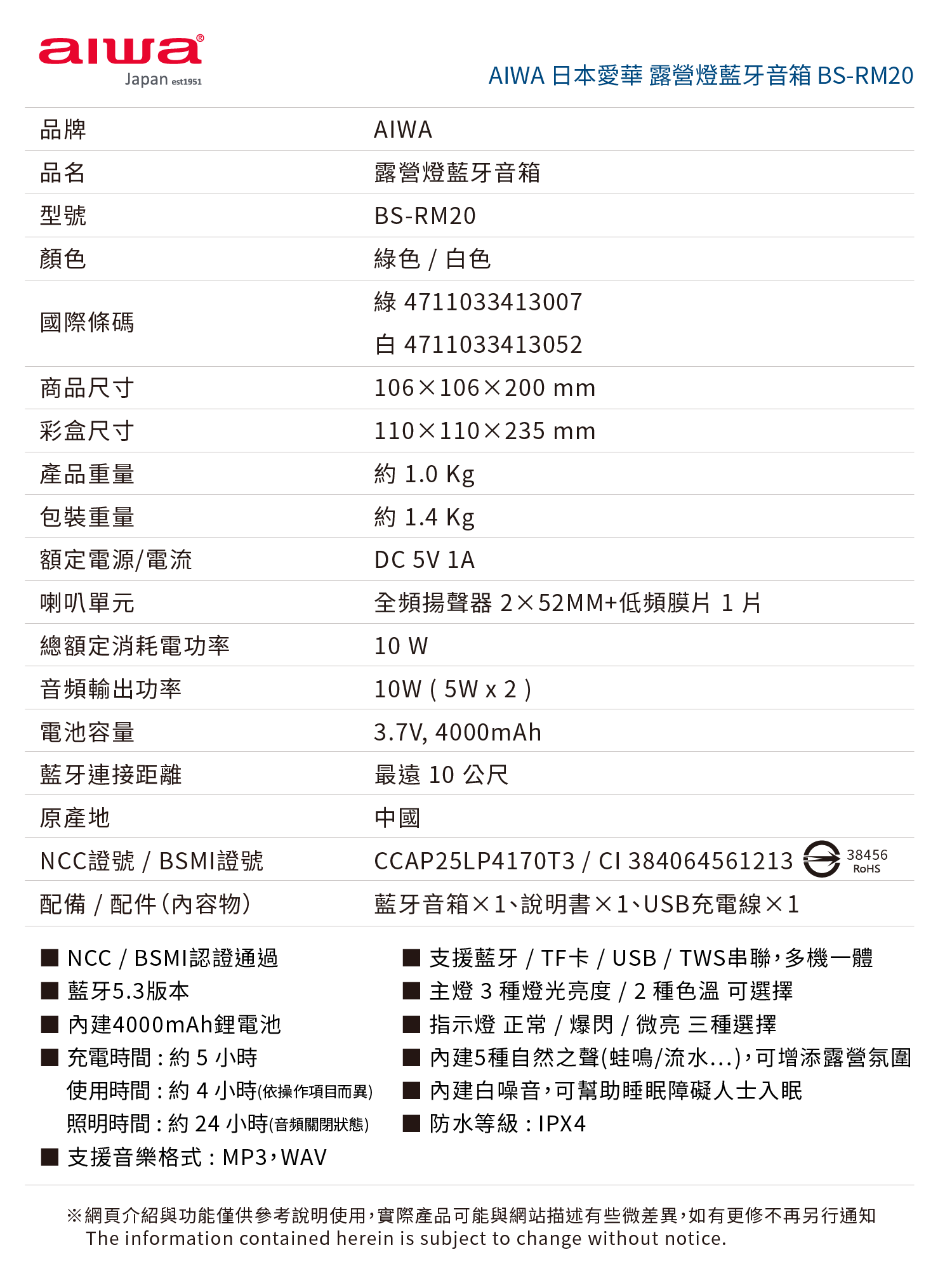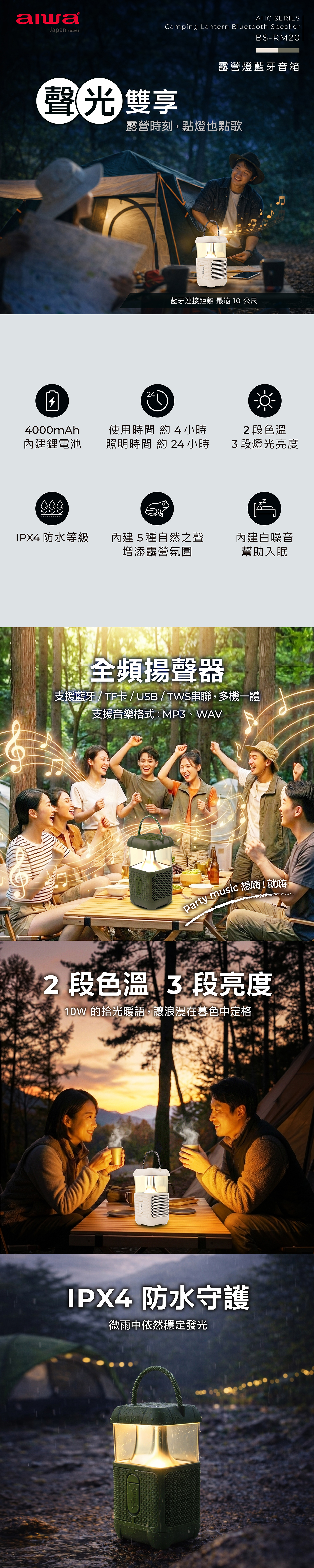 - 內建5種自然之聲 ( 蛙鳴/流水… ) ,可增添露營氛圍
